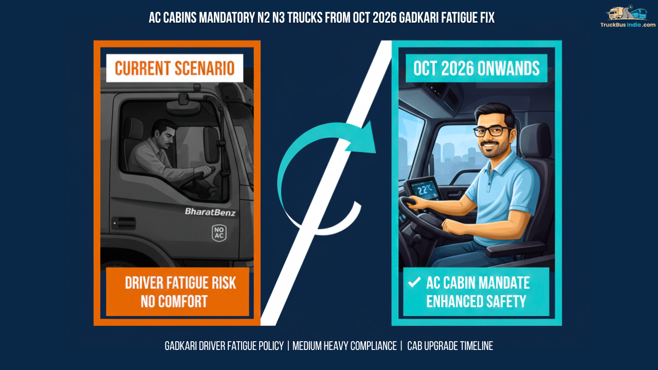 India’s medium and heavy truck segment is headed for a major comfort and safety upgrade. From October 2026, air-conditioned cabins will be mandatory for all N2 and N3 cat...